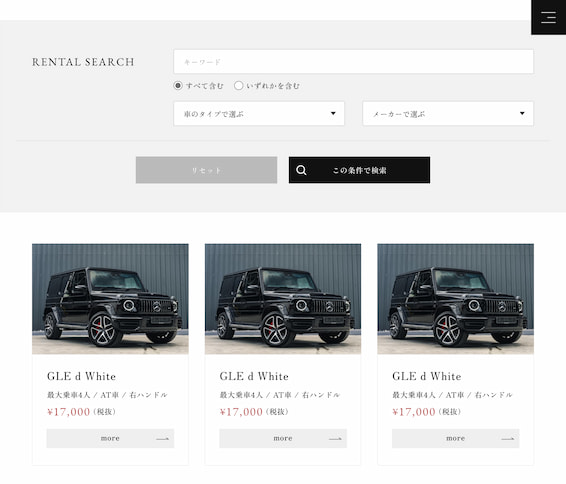 ラインナップページでは、車のタイプ・メーカーでそれぞれ検索をかけることができますので、その検索結果の中から乗りたい車を選んで頂き、車詳細/予約ページへお入り下さい。