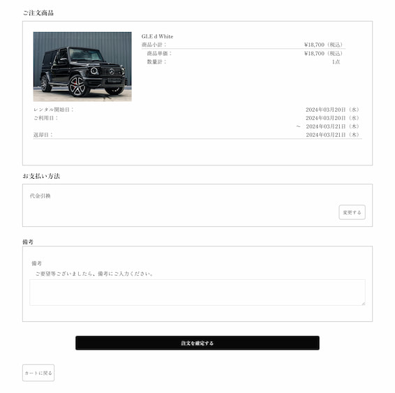 フォームの内容を記入し「入力内容確認」していただいた後、「注文を確定する」をクリックして予約完了となります。予約内容を修正したい場合は「戻る」ボタンを押して予約フォームにもどり修正して下さい。